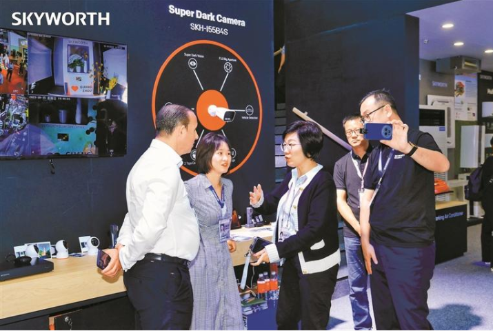 记者在现场看到,创维的极黑光摄像头,引来众多外国采购商争相走进暗室体验神奇效果;在重量仅69克的AR眼镜前,许多采购商竖起大拇指点赞。站在超大电视屏幕面前,来自中东的皮特本子上已经密密麻麻地记满了各种产品的参数。他告诉记者,中国的家电品牌如今在中东十分受欢迎。